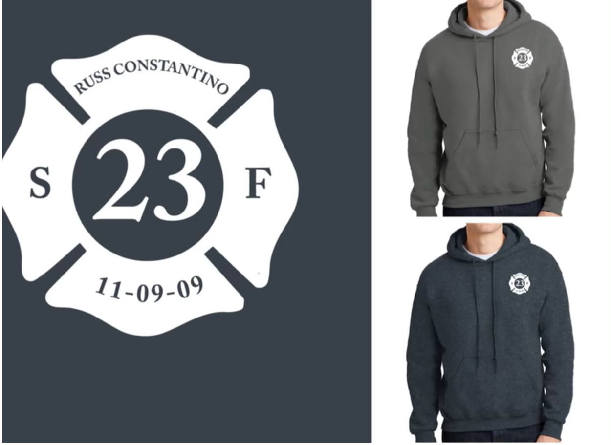 In time for cooler weather and in recognition of Russ’ Observance Day we are proud to introduce this Memorial Hoodie. It showcases a custom design for the special S23F logo on the front and unique artwork for the drawing on the back.